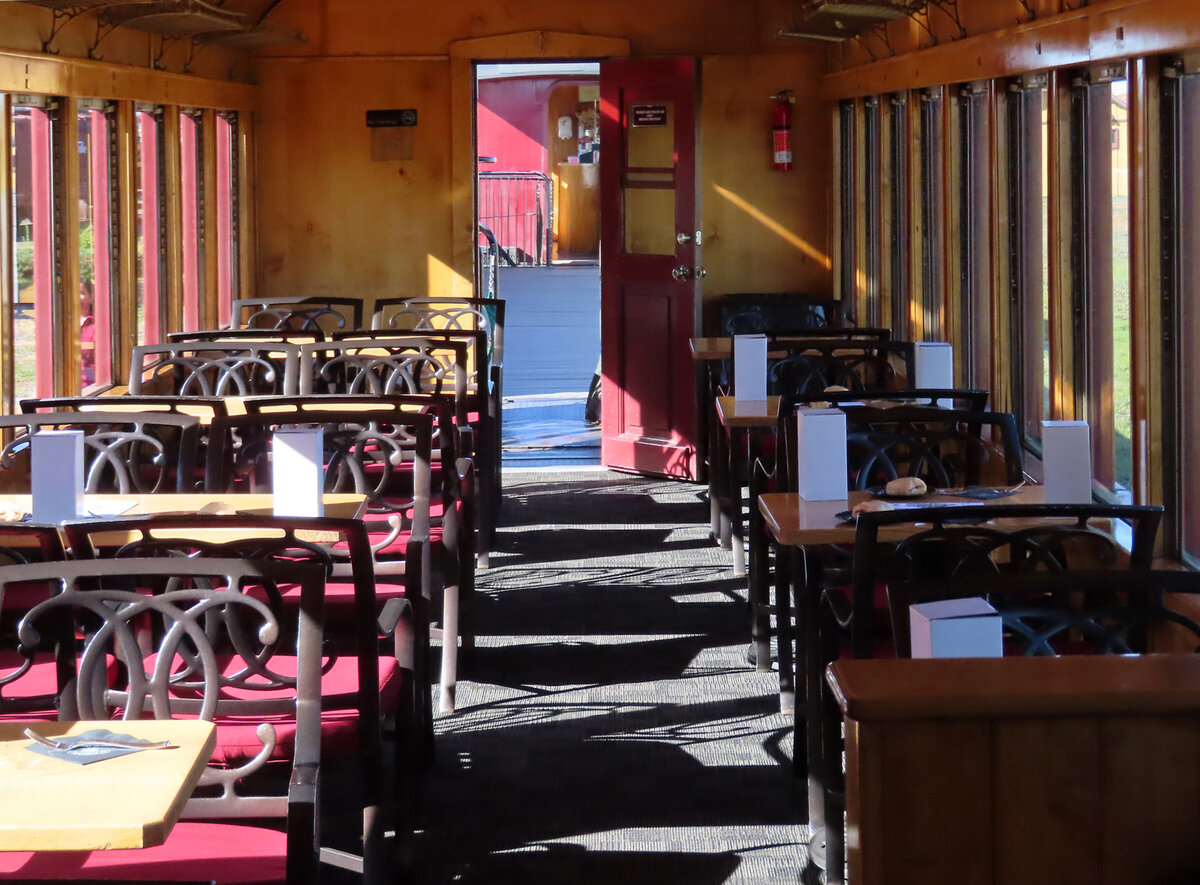 Wenn man früh genug einsteigt, kann die typisch amerikanische Inneneinrichtung des historischen Personenwagens der Standardklasse (fast) ohne Passagiere aufgenommen werden. Antonito, CO, 30.8.2022