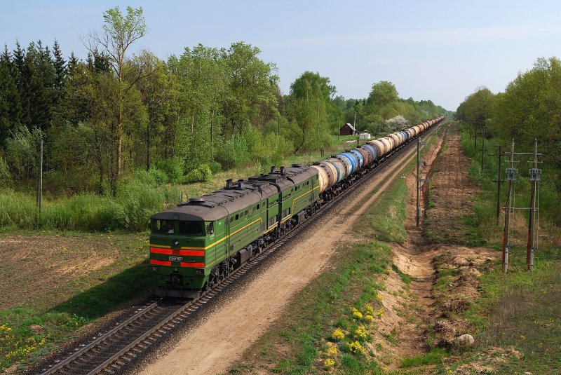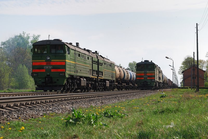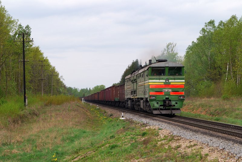 Leider hatte es nur noch zu einem Teleschuss über die Bahnsteige hinweg gereicht. Die 2TE1011-3612 fährt mit einem Güterzug von Süden kommend durch den Bahnhof Gomel. 28.05.2015 um 12:25 Uhr. Jörg Ohlhaver
