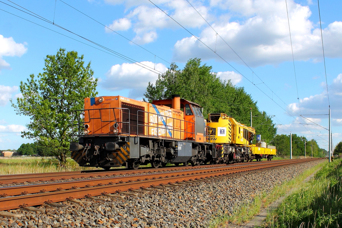 ein tolles Bild von der MaK G 1206 mit dem Kranzug.