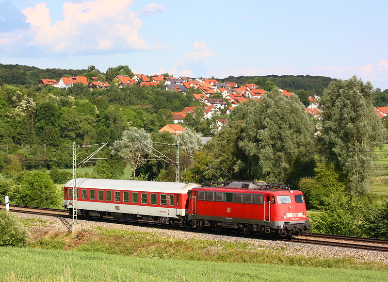 115 509 bringt hier einen Nachtzugwagen durchs Filstal. Aufgenommen am 02.06.09 bei Urspring. (zum Bild)