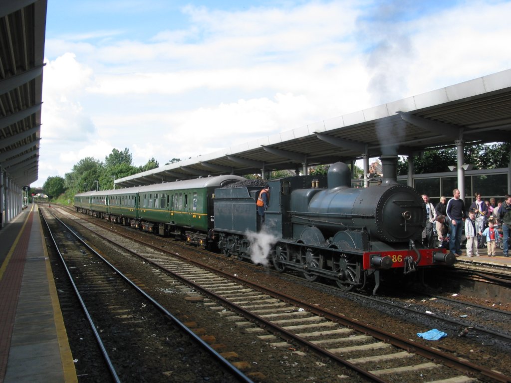 J15 Nr. 186 ist mit Museumszug der Railway Preservation Society of Ireland am 28. August 2004 aus Belfast kommend in Bangor eingetroffen. Die Lokomotive mit Baujahr 1876 wird heute in Whitehead betreut. (zum Bild)
