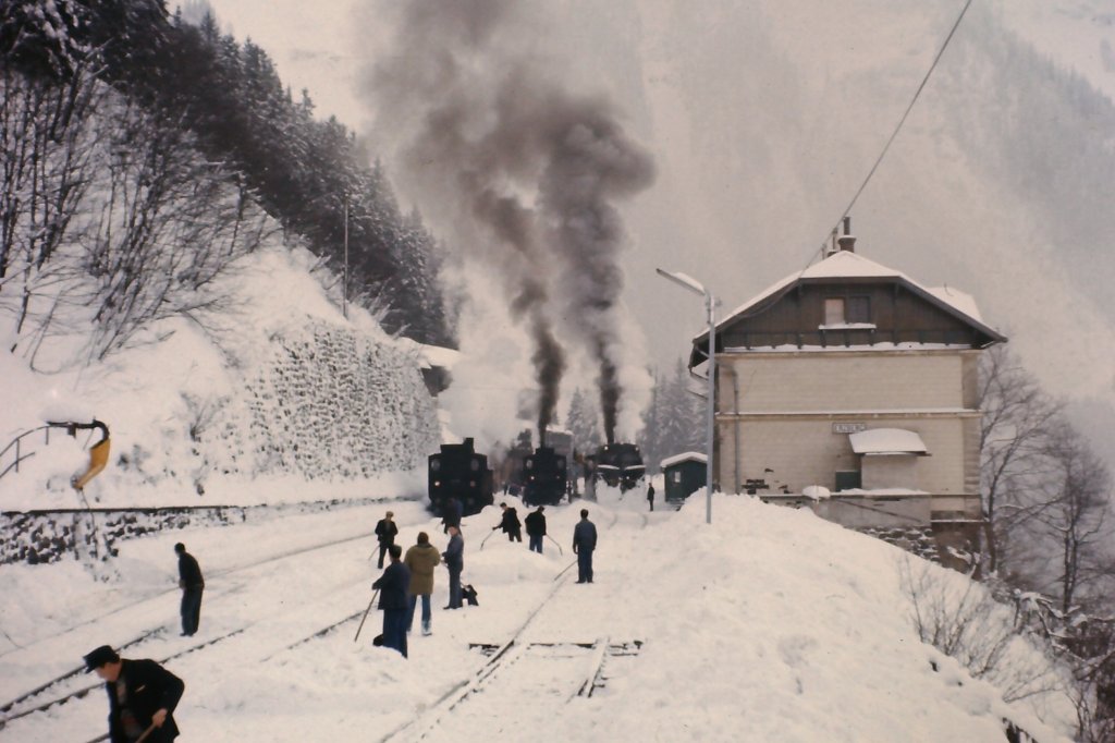 Mitte der 1970er Jahre haben viele Menschen und ein Schneepflug im Bahnhof Erzberg für den reibungslosen Abtransport des gewonnenen Erzes mit den mit 97ern (hier: 97 204 und 97 209) bespannten Erzzügen nach Vordernberg gesorgt. (zum Bild)