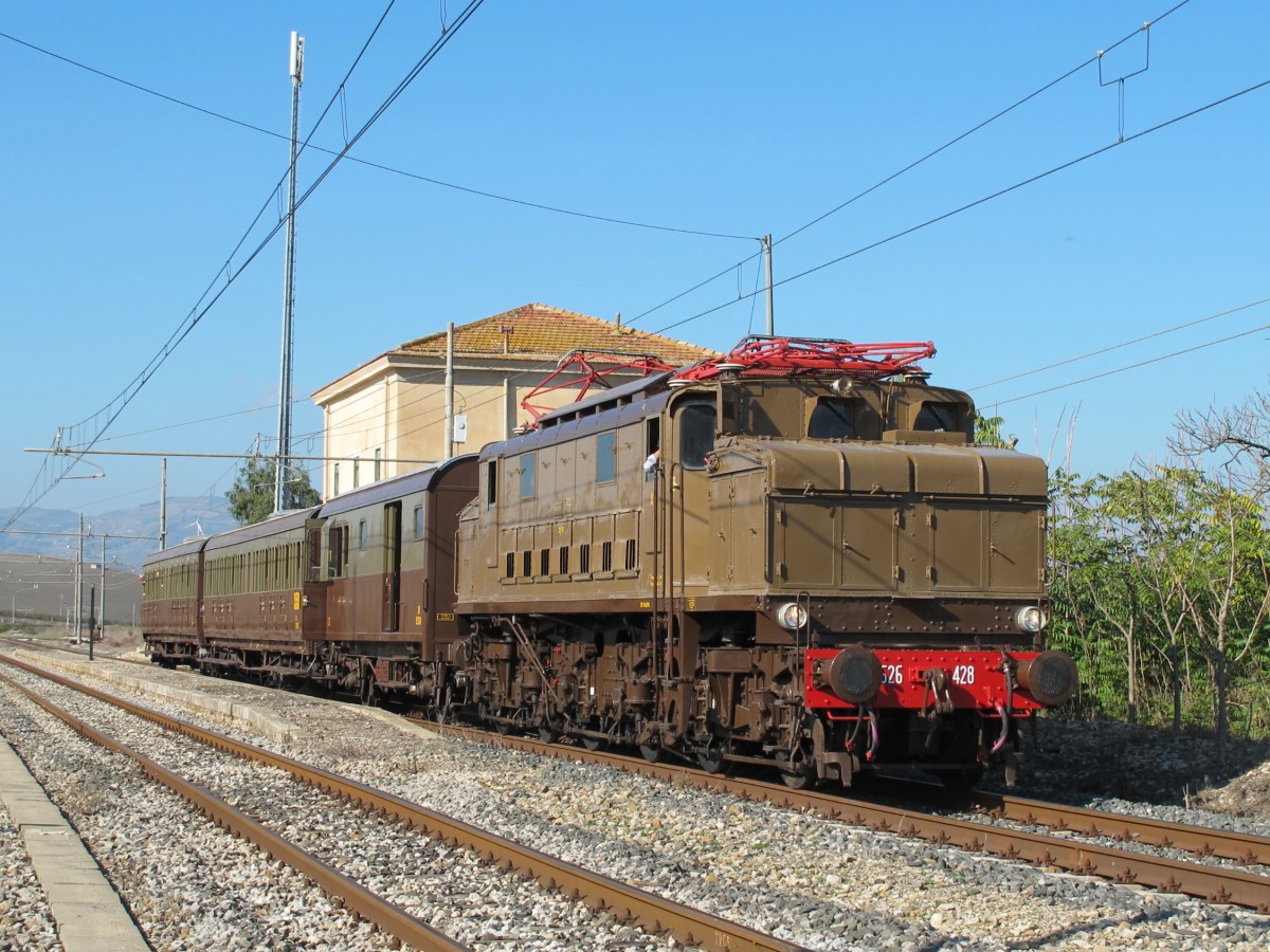 E626 428 am 26. Oktober 2013 mit historischem Zug für die DGEG zwischen Roccapalunga-Alia und Caltanissetta Xirbi. (zum Bild)