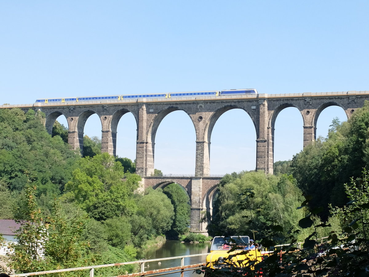 RE 3 Chemnitz - Leipzig bei der Fahrt über das Göhrener Viadukt am 18. August 2016. (zum Bild)