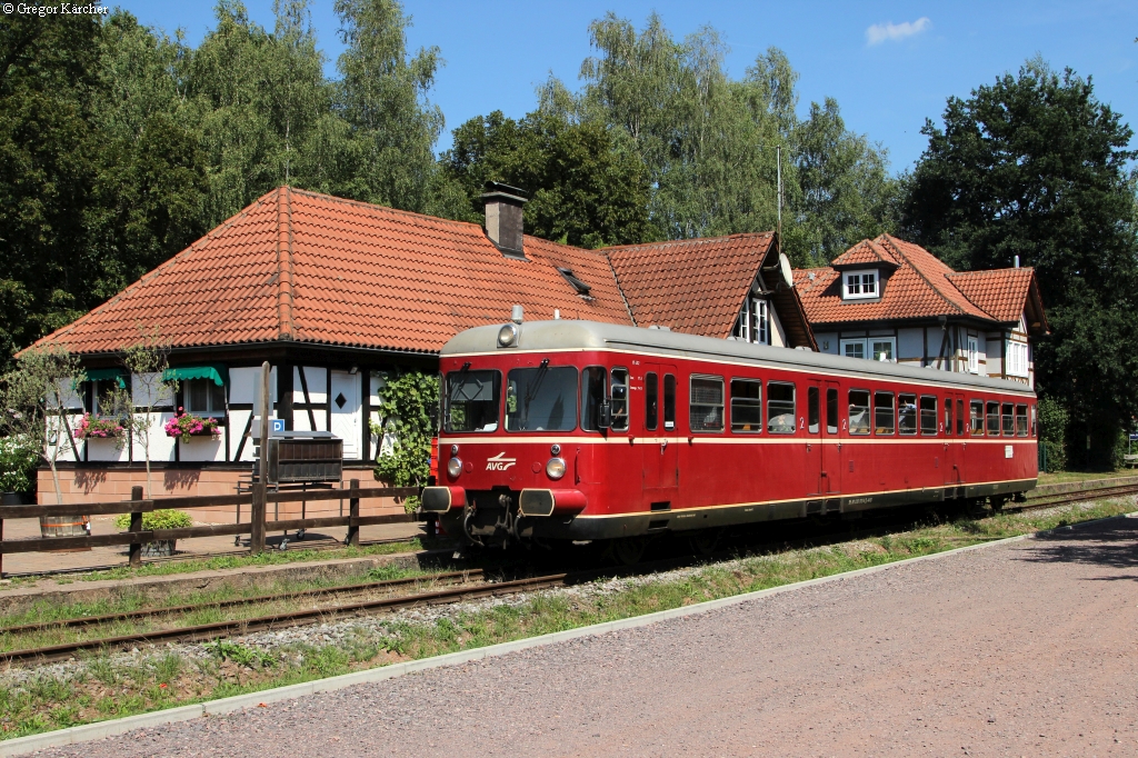 301 013-8 der AVG als E 85289 (Bundenthal-Rumbach - Hinterweidenthal Ost) verlässt den Haltepunkt Busenberg-Schindhard, 02.08.2015. (zum Bild)