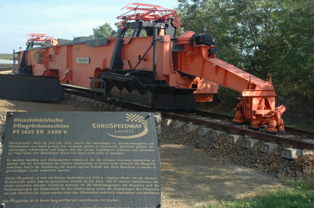 Dieselelektrische Pflugrückmaschine Pf 1435 ER 2400 V wurde im Braunkohletagebau für die Gleisverschiebung eingesetzt. Diese steht heute am EuroSpeedway als Museumsstück. Gesehen am 05.10.2011. (zum Bild)