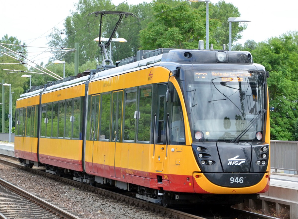 Stadtbahnfahrzeug 946 als Schnellbahn, fährt die AVG mit den neuen Bombardier der neuen Bauart ET2010 und gehört zu der Fahrzeugfamilie Flexity Swift. Als S 51 auf der Strecke Karlsruhe-Germersheim, hier am 09.07.15 bei Germersheim unterwegs. Technische Daten: Bauart: Zweirichtungsfahrzeug, Spurweite: 1435 mm, Länge: 37 030 mm, Höhe: 4000 mm, Breite: 2650 mm. (zum Bild)