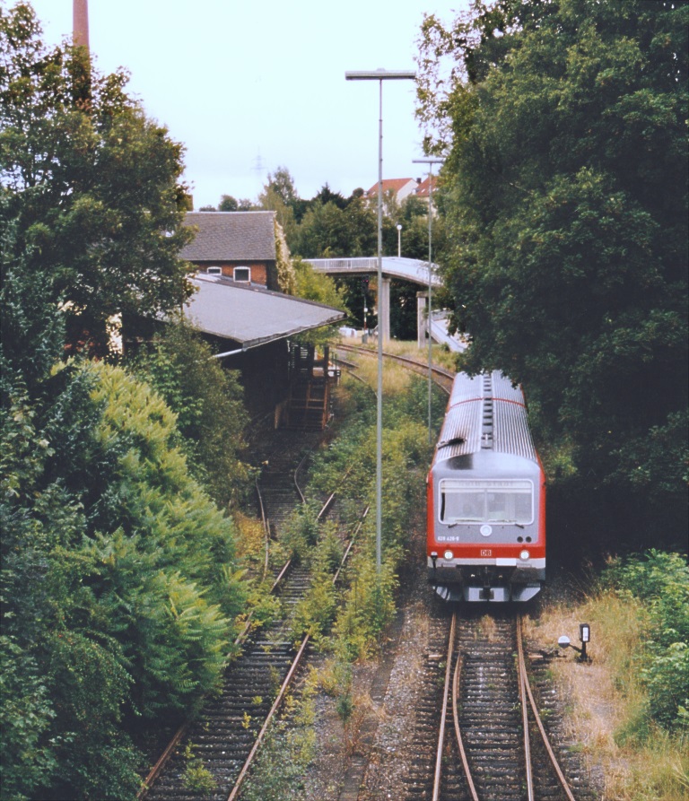 Sehr interessantes historisches Bild! Wenn man heute mit dem ICE die Neubaustrecke daran vorbei fährt, sieht man das gekappte Anschlußgleis aus der Erde gucken am "Bahndanm". Das Gleis ist etwa bis zum Bahnübergang im Feld rechts im Bild überschüttet worden beim Bau der Neubaustrecke. Aber genau da endet bisher der Neubau der Strecke.