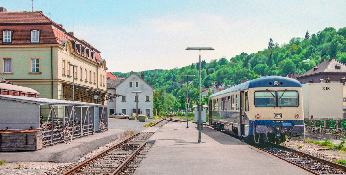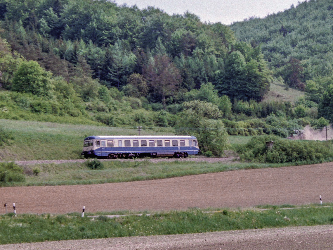 627 105 war am 11.5.93 auf der nur 5 km langen Fahrt in Eichstätt vom Bahnhof zur Stadt. Rechts vom Bild liegt Wasserzell und links vom Bild Rebdorf-Hofmühle, mehr Stationen gibt es nicht. Hinter dem Hügel liegt der Flugplatz Eichstätt. (to the image)