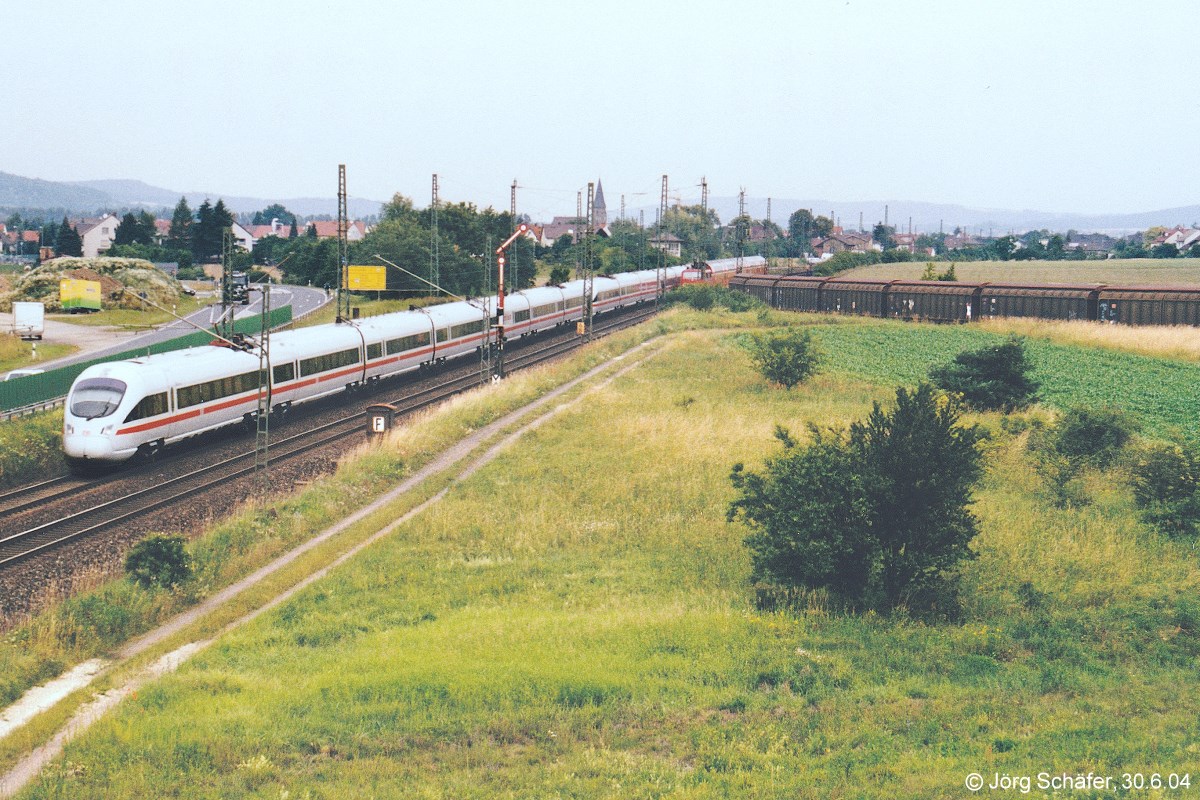 Großes Zugtreffen südlich von Breitengüßbach am 30.6.04: Links ein ICE von Berlin nach Nürnberg, in der Mitte ein Doppelstock-RE nach Saalfeld und rechts ein Güterzug auf dem Weg zur Muna. (to the image)