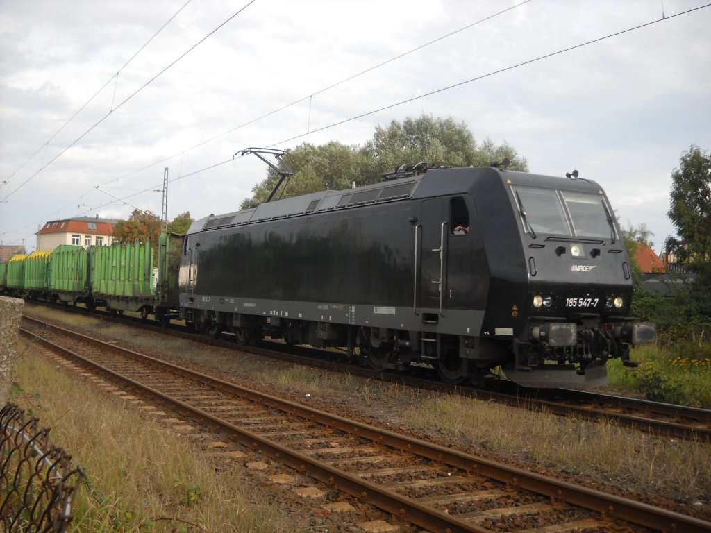 185 547-7 der MRCE die von der PRESS gemietet wurde fährt am 12.9.2010 mit ihrem Leeren Holzzug aus Wismar wieder los (zum Bild)