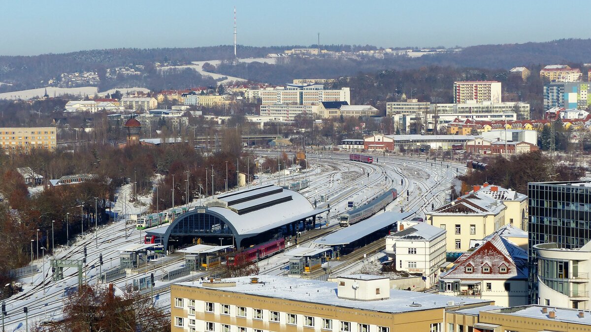 ein eindrückliches Übersichtsbild über den Bahnhof von Gera. Durch den Schnee ist der Gleisplan besonders gut zu sehen. Ebenfalls auffällig, wie weit die relativ grosse und schön hergerichtete Bahnhofshalle vom Empfangsgebäude entfernt liegt.