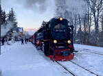 winterliche Schmalspurromantik, ein Zug mit Personenwagen und einem Normalspurgüterwagen auf einem Rollwagen, so wurde früher gefahren, fantastische Aufnahme.