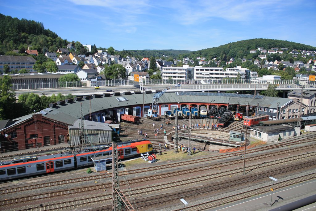 Blick auf das Lokschuppenfest des Südwestfälischen Eisenbahnmuseums am 18.8.2012 vom Parkdeck der City-Galerie Siegen. Übrigens der Mann in blau der zwischen Drehscheibe und 261er kniet und fotografiert ist Armin Schwarz. (zum Bild)