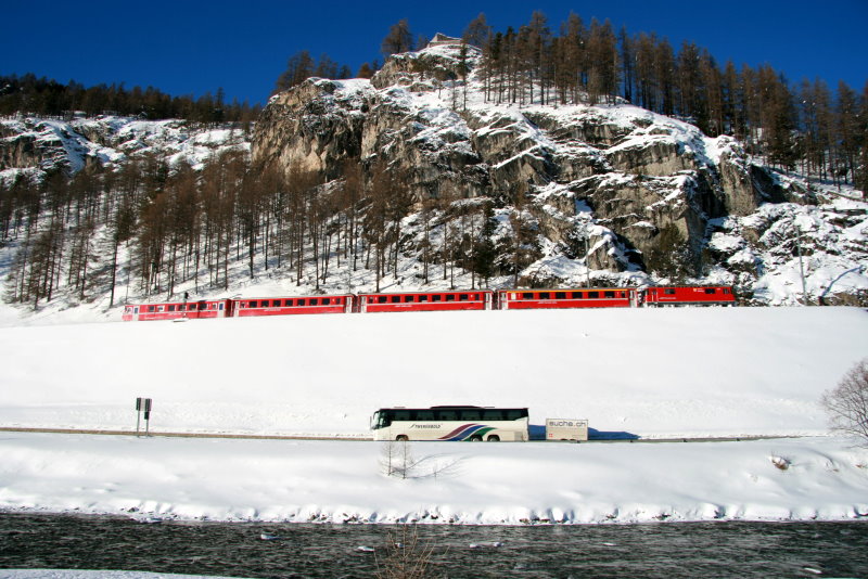 danke für Deinen Kommentar. Das war jetzt aber auch ein unglaublich schönes Wochenende! Ich habe gestern auch gesehen, was noch schöner ist als einen Bahnreise durch das Winterwunderland. Eine Reise mit dem Doppeldeckerpostauto durch die Berge. Ich beneidete die Leute, die die Plätze über den Fahrer ergattert hatten. Das muss eine traumhafte Tour von St. Moritz nach Chur gewesen sein. Die Bilder siehst du bei den Bus-Bildern.