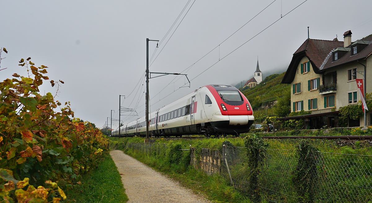 trotz etwas trüben Wetters eine sehr schöne Aufnahme mit allem was dazu gehört, die Kirche von Ligerz, ein ICN auf der letzten Einspurstrecke zwischen Biel und Neuchâtel und ganz links im Bild sich herbstlich verfärbenden Reben.