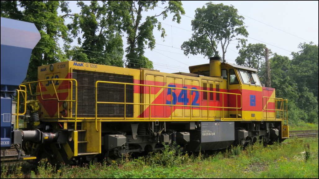 Ab in das Ausweichgleis und warten! Heißt es für die 542 der Eisenbahn und Häfen Duisburg. Gut 10 Minuten später geht es dann weiter in Richtung Angertal. Seitenansicht der Mak G 1206 beim Halt in Lintorf ,August 2015. (zum Bild)