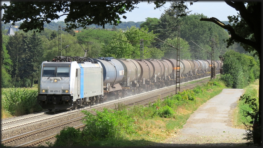 Die Railpool Lok 186 455-2 ist mit ihrer Kesselwagenfuhre nach Belgien unterwegs. Hier zu sehen auf der Rampe hinauf zum Gemmenicher Tunnel am Friedrichweg unweit von Aachen. Datiert vom 31.Juli 2018. (zum Bild)