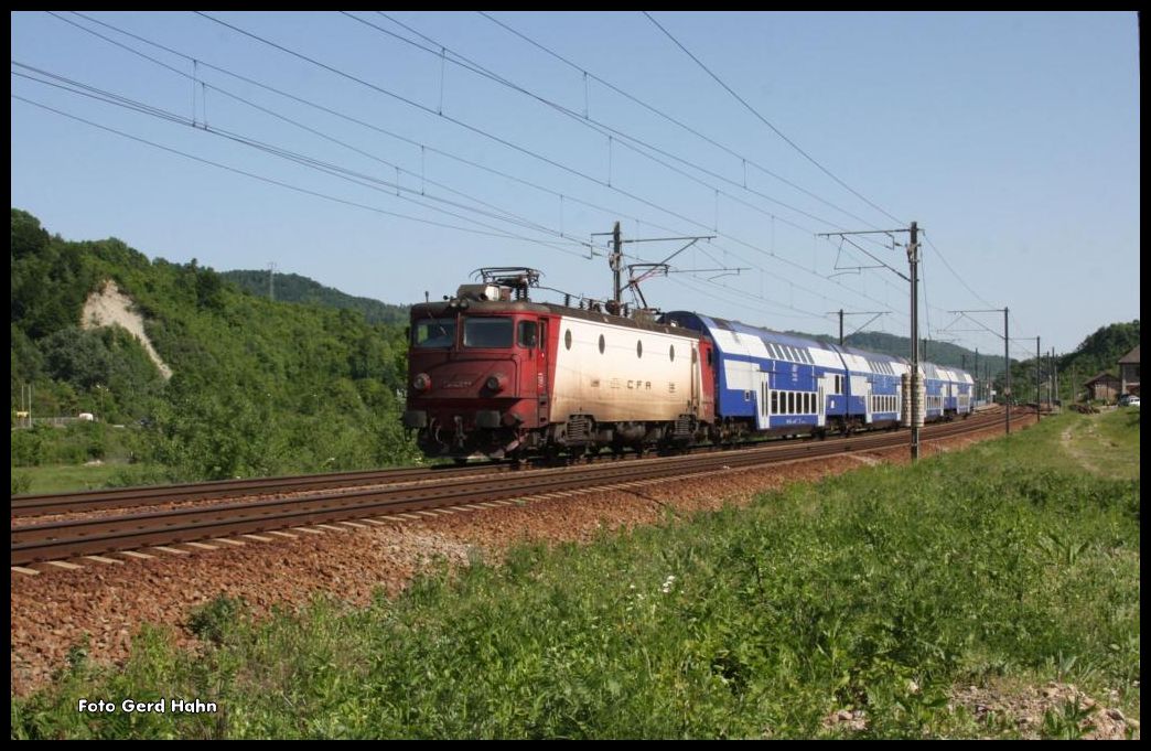 41-0210-3 hat einen Dosto Wagen Park am Haken, der vermutlich aus ehemaligen Reichsbahn Beständen bzw. aus DDR Produktion stammen dürfte. Der Zug hat hier am 22.05.2015 gerade den Haltepunkt Breadsa verlassen und fährt nun weiter über Predeal nach Brasov. (zum Bild)