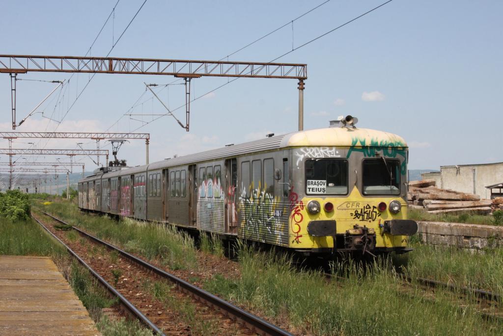 Man sieht es dem Elektrotriebwagen an, dass er schon einige Jahre auf dem Buckel hat. Früher dürfte er der SNCF im Nahverkehr gedient haben. Heute erlebt er eine Weiterverwendung im rumänischen Nahverkehr. Als Zug 3503 verläßt der ET am 21.5.2015 hier den Bahnhof Bod auf dem Weg nach Teius. (zum Bild)