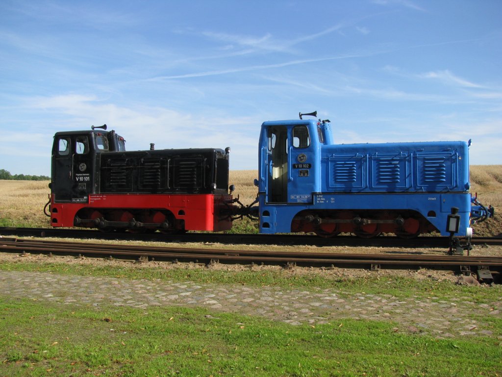 Schmalspur-Diesellokomotiven V 10 101 und V 10 102 der Prignitzer Kleinbahn, auch "POLLO" genannt, Mesendorf [20.08.2011] (zum Bild)