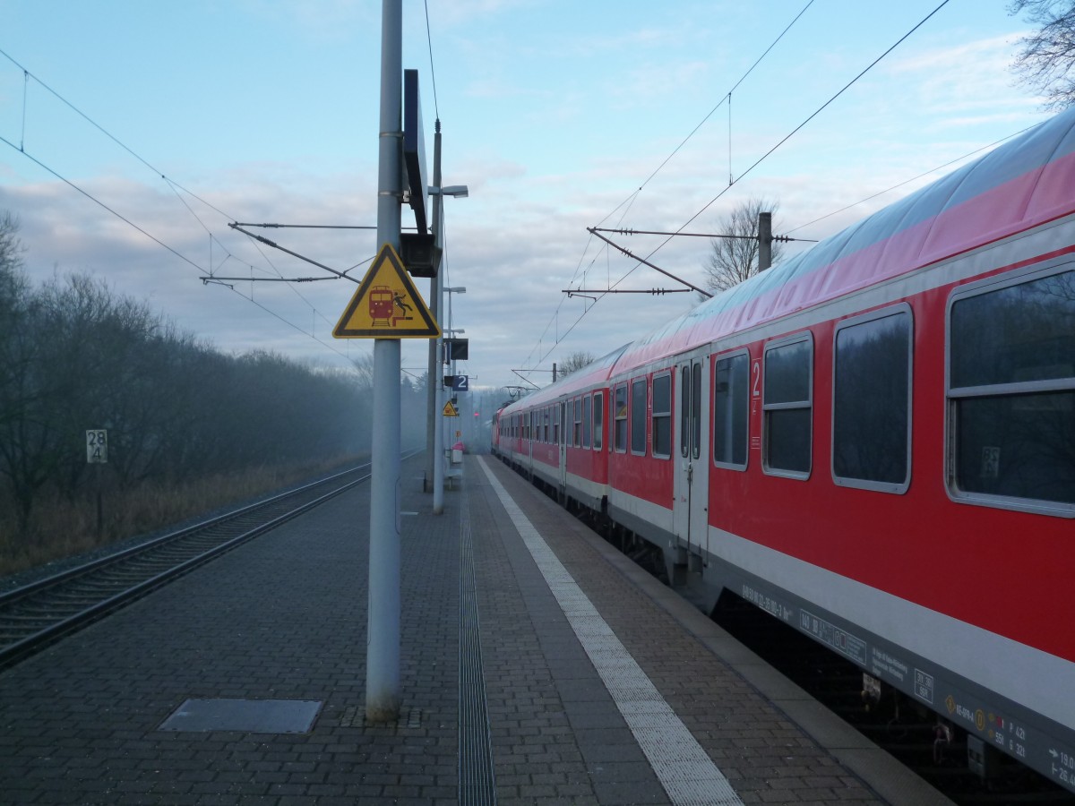 -- 07.01.2014 -- Ein nebliger Januarmorgen... RE nach Stuttgart Hbf aus Crailsheim im Bahnhof Sulzbach (Murr) an der Murrbahn. (zum Bild)