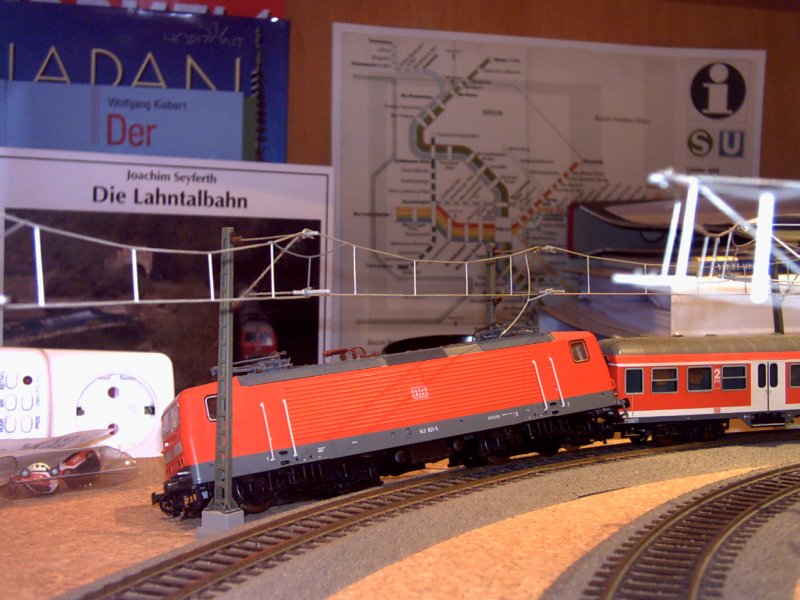Modellbahncrash. ein herunterhängenes teil in der oberleitung ist im pantofraph hängen geblieben und hat somit die lok 143 921 aus den gleisen gehebelt. der lokführer hat überlebt. der netzplan im hintergrund rechts ist von den berliner verkehrsbetrieben (BVB) von 1988. links ein sehr interessantes buch (zum Bild)