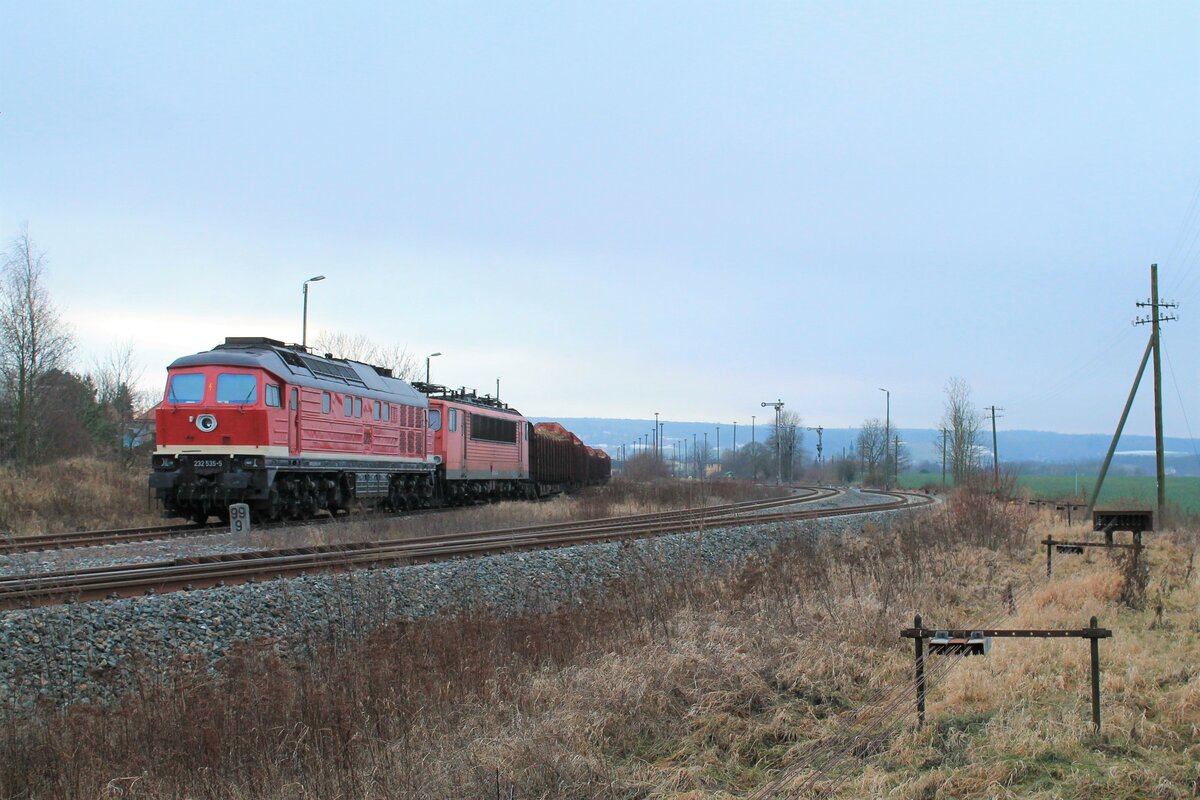 232 535-5 und 155 222-3 der Wedler Franz Logistik (WFL) mit einem Holzzug nach vollendeter Beladung am 14.1.2022 in Triptis. Am Abend ging es dann über Saalfeld/Saale nach Kaufering (zum Bild)