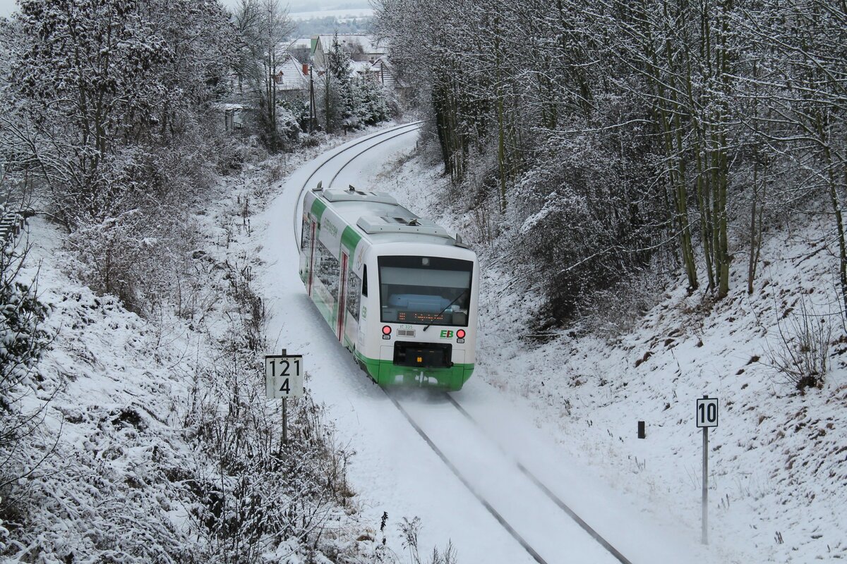 VT 335 der Erfurter Bahn (EB) am 8.1.2022 bei der Durchfahrt durch Pößneck in Richtung Gera (zum Bild)