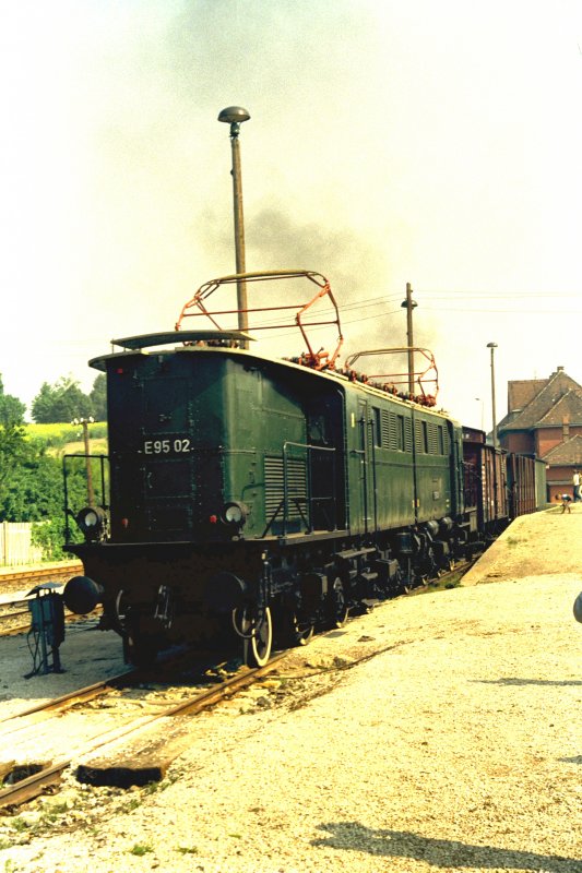 E 95 der DR/DRG, hier auf einer Fahrzeugausstellung in Erfurt-West, um 1985 - digitalisiertes ORWO-Foto (zum Bild)