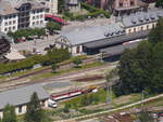 Ein eindrücklicher Blick auf den Bahnhof vom Chamonix Mont Blanc und im Vordergrund auf den Bahnhof der Zahnradbahn zum Mer de Glace (Chamonix-Montenvers), die wie man hier gut sieht, mit normaler Fahrleitung elektrifziert ist (im Gegensatz zu den Stromschinen der "Alpen Métro".