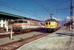 Der südfranzösische Grenzbahnhof Cerbère im Jahr 1993. Hier enden auch die Gleise der iberischen Breitspur, so dass spanische Fahrzeuge bis hierher fahren können. Rechts steht der spanische ET 438-039 und links die französische BB 7245 "Nez cassés". Die Loks der Baureihe BB 7200 waren lt. Wikipedia die letzten ausschließlich für den Gleichstrombetrieb ausgelieferten Loks der SNCF. (alla foto)