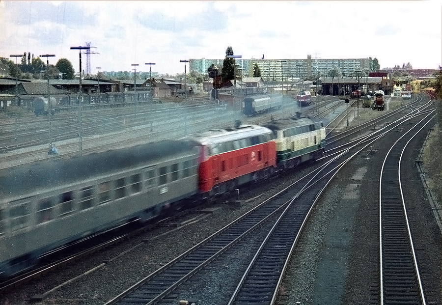 Doppeltraktion 2x218 bei der Ausfahrt aus Lübeck nach Hamburg Hbf. Im Hintergrund ist noch das Bw Lübeck zu erkennen. Aufn. 1988 Minolta XD7 (zum Bild)