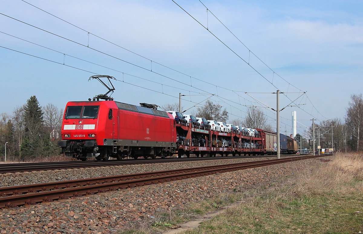 145 051-9 verlässt am 25.03.2017 mit dem GA 52814 (Mosel - Braunschweig Rbf) das VW-Werk in Mosel. (to the image)
