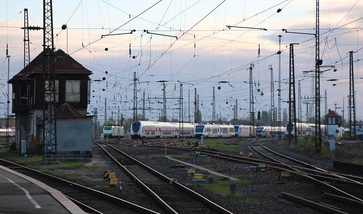 Blick auf das Leipziger Vorfeld am 16.04.2017. Zusehen sind einige Triebwagen von der MRB, zwei IC2 Dostos , und eine Captrain Lok. (to the image)