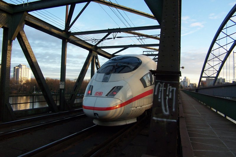 Als Bewohner von Frankfurt am Main kenne ich natürlich diese Brücke, und kann dazu anmerken, daß der Fotograf bei der Aufnahme keinesfalls auf verbotenem Gelände stand. In Blickrichtung rechts neben der Brücke - aufgrund des Schattens kaum zu erkennen - befindet sich ein Fußweg.