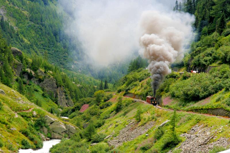 Von der Furkapassstraße hat man einen phantastischen Blick auf die Dampfbahn im Tal der Furkareuss; 14.08.2010 (zum Bild)