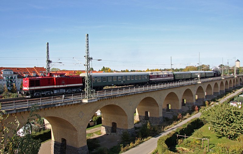 Auf dem Weg zum Eisenbahnfest nach Weimar sind am 09.10.2009 Zuglok 112 565-7 der Press mit Bomz-Wagen des TEV, Lok 207(Ex BR 118)der MEG sowie drei Wagen des EMBB-Leipzig mit Schlußlok 52 8154-8. Hier im Bild festgehalten auf dem Wahrener Viadukt in Leipzig. (zum Bild)