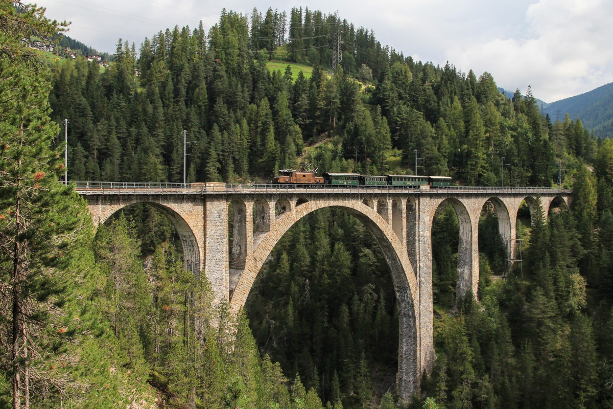 ein wunderschönes Bild vom Wiesener Viadukt mit dem historischen RhB-Zug!
