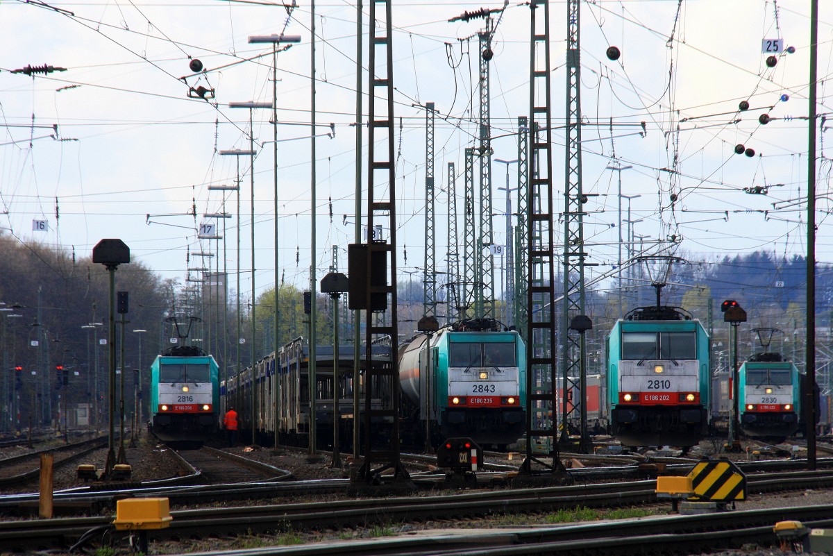 Die Cobra 2810 rangiert in Aachen-West ganz links steht die Cobra 2816 mit einem langen Containerzug und rechts ist die Cobra 2830 auch mit einem langen Containerzug,2843 steht vor einem langen Kesselzug und wartet auf die Abfahrt nach Antwerpen-BASF(B). Aufgenommen in Aachen-West bei Sonne und Regenwolken am 23.3.2014. (zum Bild)