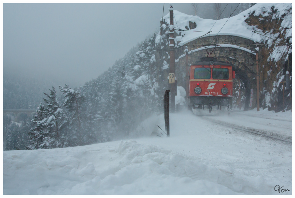 Schöne Bildidee. Muss die arme Lok auf ihre alten Tage sogar noch Güterzüge ziehen...