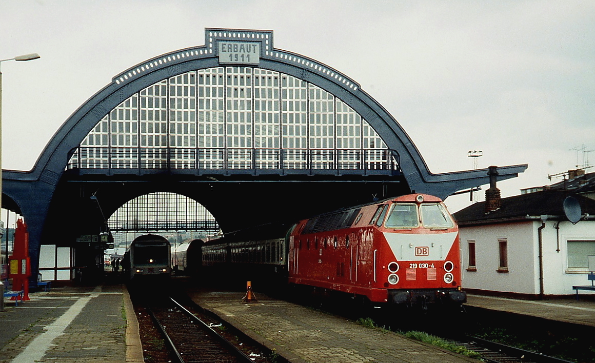 Im April 1997 wartet 219 030-4 im Bahnhof Gera auf die Ausfahrt (zum Bild)
