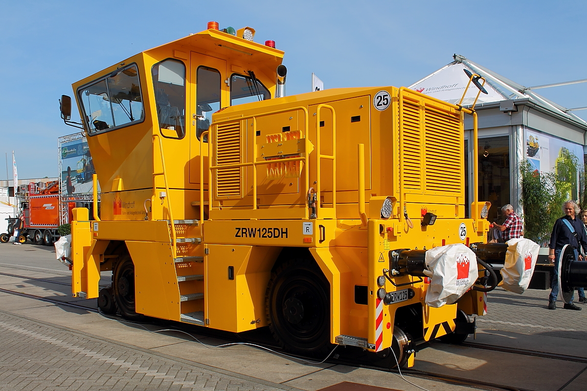 Der Aussteller Windhoff präsentiert sich auf der InnoTrans am 28.09.2014 in Berlin mit dem vollgummibereiftem Zwei-Wege-Rangierfahrzeug Windhoff ZRW125DH. Gewicht: 24 t Hg: 25 km/h Antrieb: Caterpillar 205 kW (to the image)