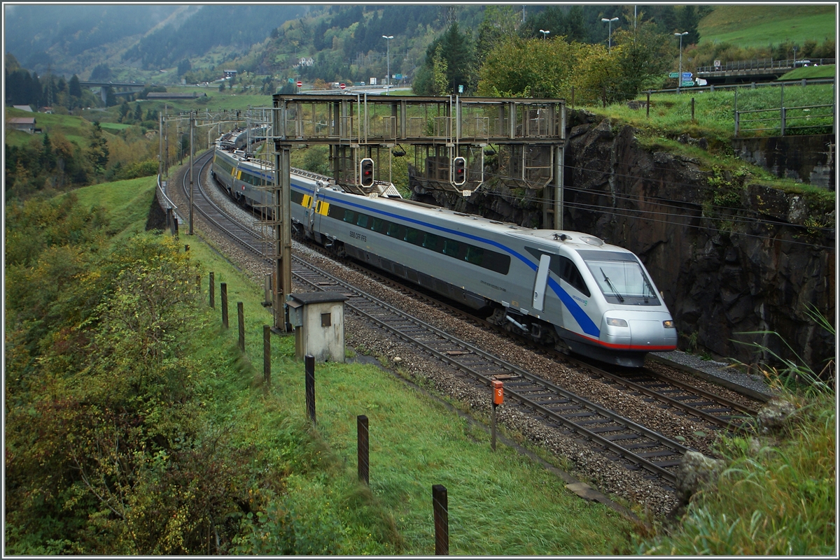 Der von einem SBB ETR 470 geführte EC 312 von Milano nach Zürich fahrt unterhalb von Wassen gleich in den Kirchbergtunnel. 10. Okt. 2014 (to the image)