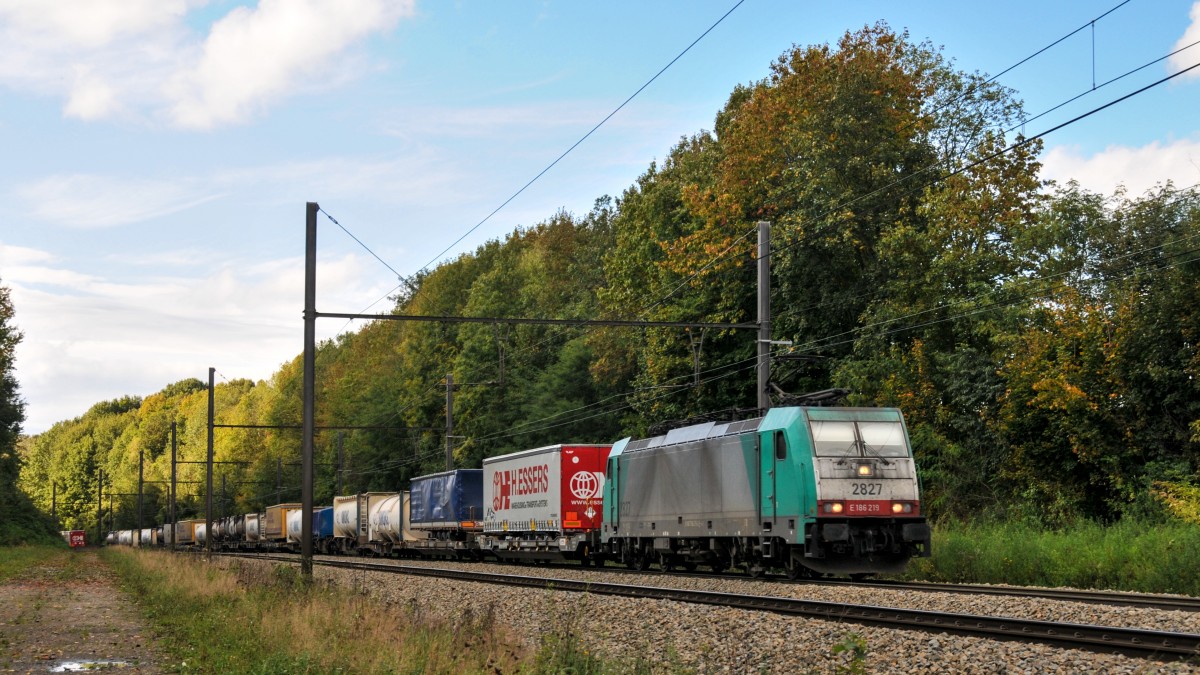 Mit einem langen Güterzug am Haken rollt Cobra-Lok 2827 (186 219) zügig Richtung Montzen und weiter Aachen-West. Aufgenommen am 11/10/2014 bei Remersdael. (to the image)