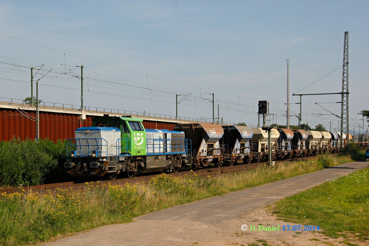 G 1700BB LDS vossloh mit einem Schotterzug am 17.07.2014 in Köln Porz Wahn. (zum Bild)