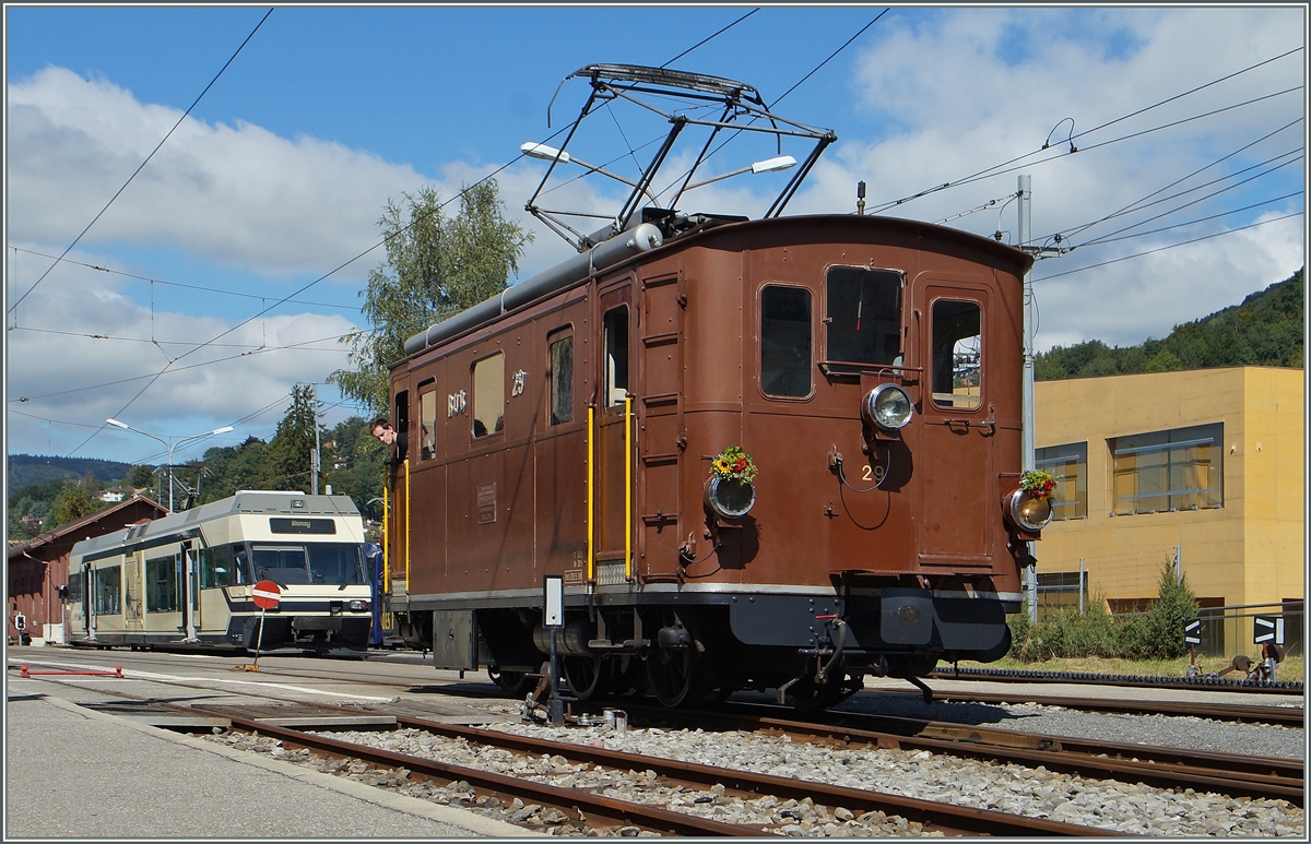 "BERNE EN FETE" bei der Blonay Chamby Museumsbahn - die BOB HGe 3/3 N° 29 diskert mit Blumen geschmückt feiert heute ihre Einweihung bei der B-C. Hier ist die HGe 3/3 in Blonay beim Rangieren (d.h. Umfahrend ihres Zuges für die Rückfahrt nach Chamby) zu sehen. 13. Sept. 2014 (alla foto)