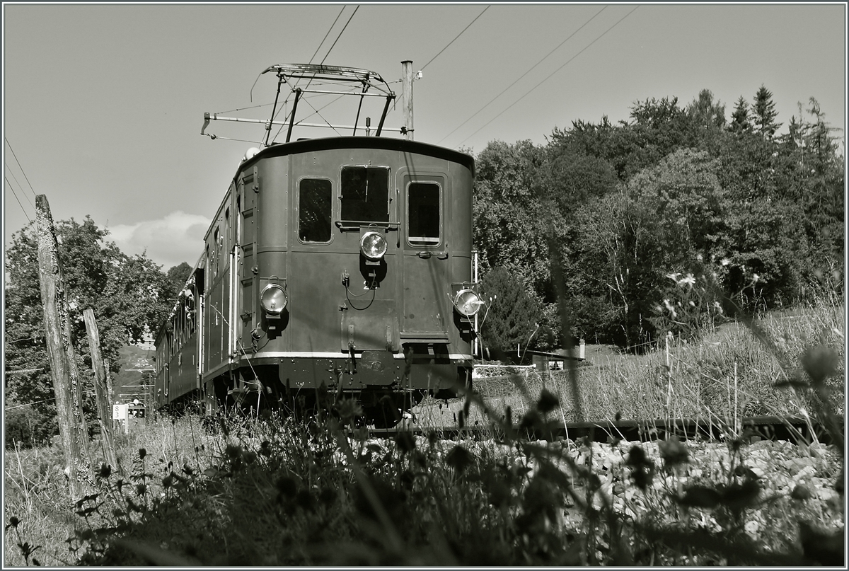 "BERNE EN FETE" bei der Blonay Chamby Museumsbahn - die BOB HGe 3/3 N° 29, mit zwei BOB Wagen auf dem Weg nach Blonay 13. Sept. 2014 (alla foto)