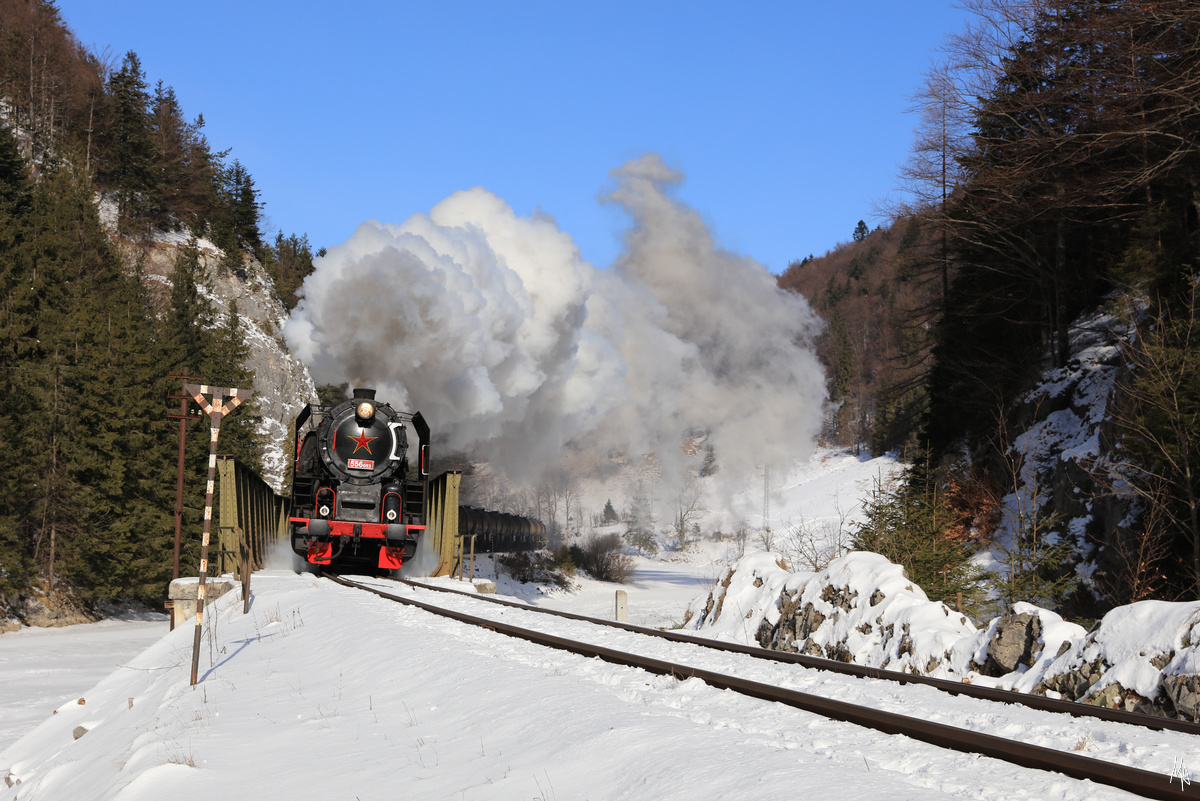 Kurz vor Dedinky befährt der Fotozug die Brücke über den Hnilec. Zuglok ist die 556.053. (09.02.2020) (zum Bild)
