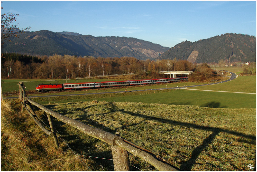 Neben dem Zaun wirkt der Zug fast unwirklich klein. Schönes Bild, nur die massive Brücke stört die Harmonie, wofür der Fotograf aber nichts kann.